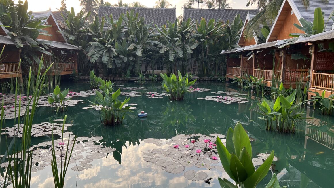 ルアンパバーンでは、去年できたばかりのホテル”The Jam Boutique Hotel “に2泊滞在した。朝食と大きなバスタブ付きの綺麗な部屋で2名1泊85ドル。4回目のルアンパバーン、今までで一番快適だった。早朝鶏の鳴き声で目覚め、池の蓮の葉や鯉を見ながらゆっくり朝食を摂る。日中はプールサイドでくつろぎ、夕方涼しくなってから、街を散策する。街は観光客で溢れている。ベトナムのホイアンも同じように混んでいるだろうな。2年前も来たお気に入りのラオス料理レストランで創作ラオス料理を食べた後、ナイトマーケットで麻のトートバッグを買い、2年前に泊まった” Indigo House Hotel”屋上のバーで2年ぶりに猫と再会しながらモヒートを飲む。ホテルにもどって池の辺りで、蛙やヤモリの鳴き声を聞きながら、ジンソーダを飲む。